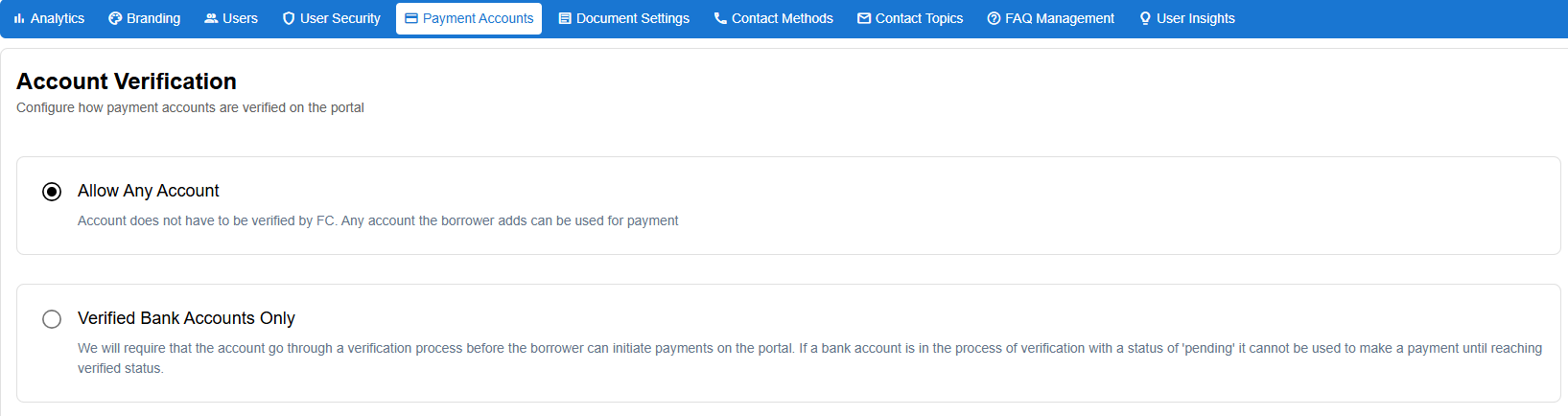 When “Allow only existing accounts” is selected, a portal user can add any bank account, but the entered bank information is immediately checked against ASPIRE. If the account exists for the customer in ASPIRE, the Portal bank account will be automatically verified and available for immediate use for Portal payments. If the account does not exist in ASPIRE, the customer will be directed to the FAQ area to help the user understand how to get their payment account verified by your team.