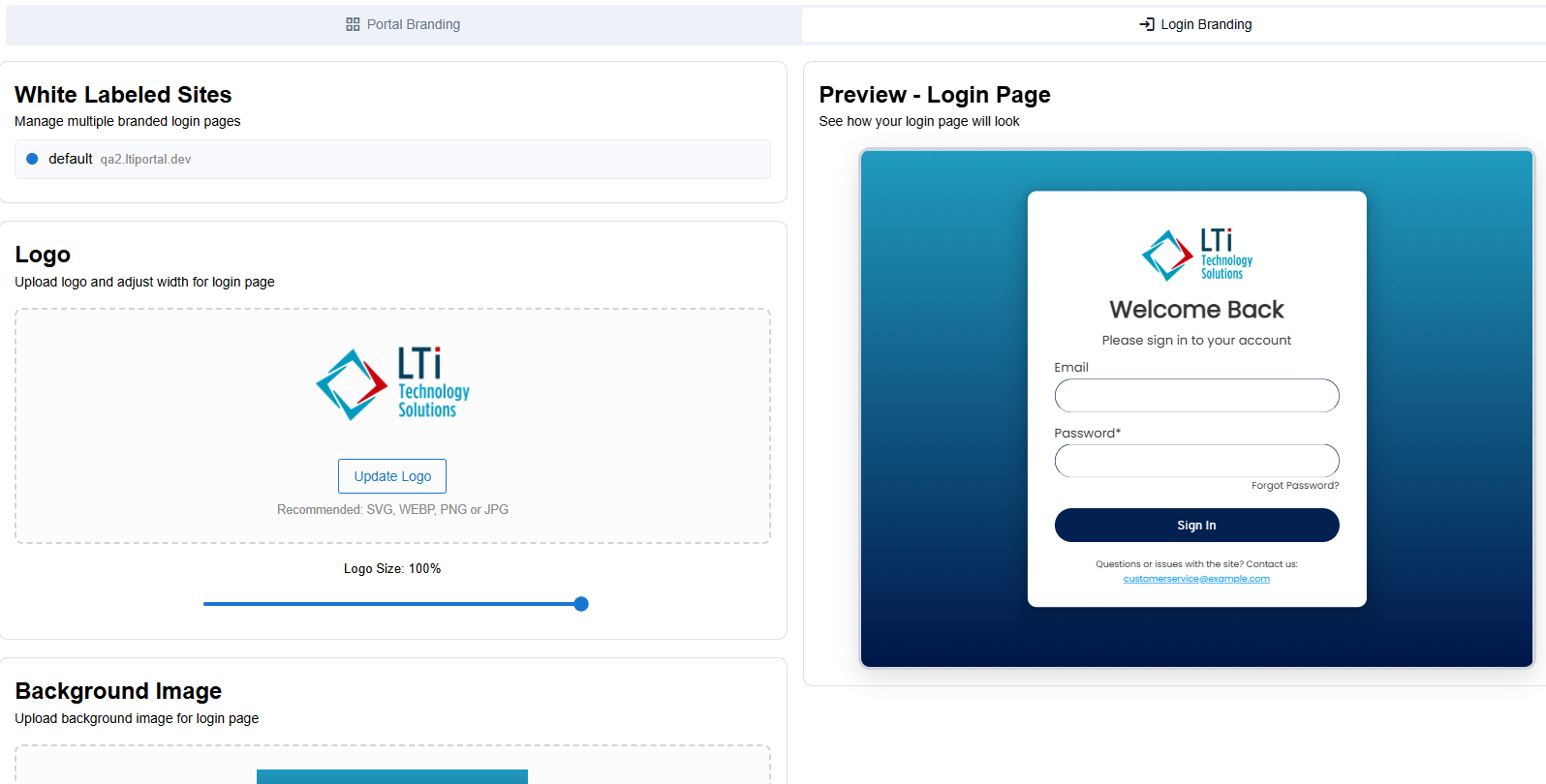 The banner that appears in the login dialog and on branded emails can be customized here, along with the scaling the size of the logo to meet your needs.