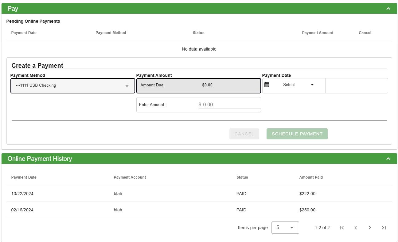 With Payments activated, the customer will have the ability to setup bank accounts, quickly pay all open charges on all contracts, pay individual contracts, and view their online payment history, as shown in the screenshots below.