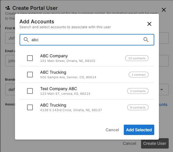 To grant access to view contracts in the Portal, a Portal user must be connected to one or more Accounts (representing Customers or Guarantors).